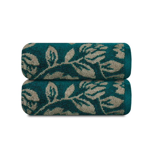 Yarn Dyed Golden Flower Border Print Jaquard Emerlad Green Hand Towel 600 GSM Pack of 2 Hand Towels
