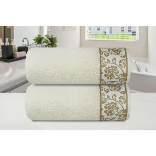 Yarn Dyed Golden Flower Border Print Jaquard Ssage Bath Towel 600 GSM Pack of 2 Bath Towels